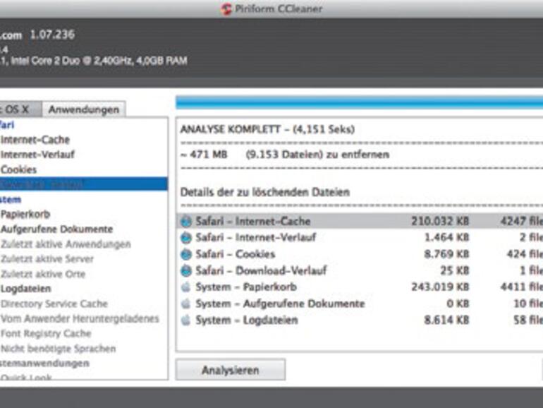 CCleaner gibt es in der Windows-Welt bereits seit einigen Jahren. Da war es nur konsequent, auch eine Version für den Mac umzusetzen. Das Programm kann kostenlos heruntergeladen werden. Der Cleaner kümmert sich um Cache-Dateien des Systems und von Anwendungen. Was untersucht werden soll, wählen Sie auf Wunsch manuell unter der sehr übersichtlichen Oberfläche aus. Mit einem Klick auf „Analysieren“ wird optional zunächst ein Probedurchgang gemacht. Mit einem Doppelklick auf einen Eintrag in der Ergebnisliste sehen Sie anschließend, was entfernt werden wird. Erst wenn Sie „Start“ drücken, beginnt der eigentliche Löschvorgang.