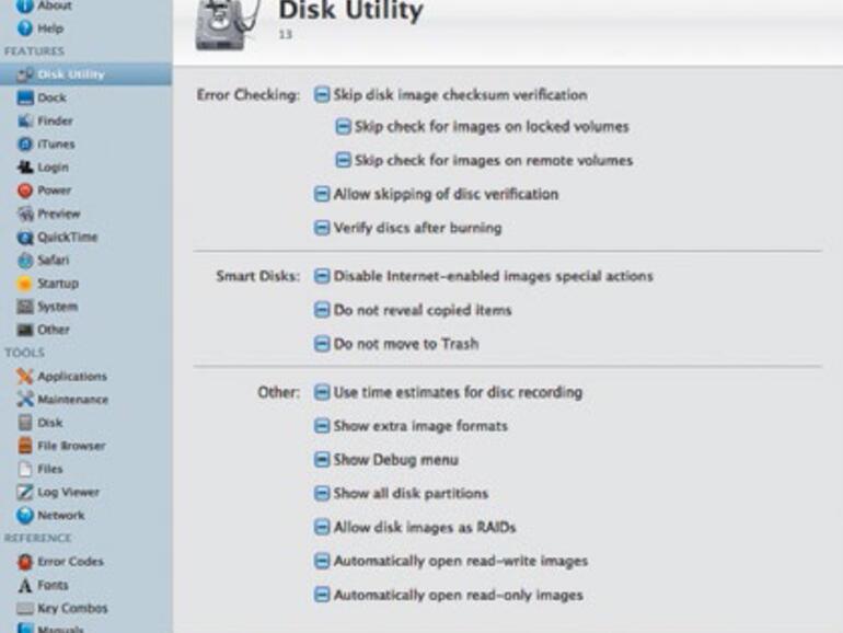 Wenn Sie an der Genius-Bar überhaupt einmal unter der Hand lobende Worte für ein Wartungsprogramm hören werden, dann gehört TinkerTool dazu. Die Software, die Sie ausschließlich über die Seite des Entwicklers beziehen können, greift nicht weiter in das System ein, sondern stellt lediglich ohnehin vorhandene Schlüssel und Werte über eine einheitliche Oberfläche bereit. Wollen Sie zum Beispiel verhindern, dass derMac automatisch auf einem Netzlaufwerk seine„DSStore-Dateien“ anlegt, die Windows-Nutzer nur verwirren: Ein Mausklick genügt! Oder Sie fertigen Screenshots zukünftig ohne Schatten an. Oder Sie schalten das Dashboard vollständig aus. Oder, oder, oder. TinkerTool überwacht keine Systemfunktionen und verspricht keine Optimierung. Dafür arbeitet die Software sehr zuverlässig und kann alle Änderungen auch wieder rückgängig machen.