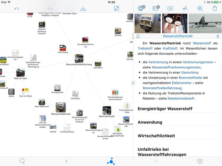 Andere Lexika haben gegen Wikipedia schon lange keine Chance mehr. Es gibt etliche Clients für den Dienst auf iOS-Geräten, doch darunter sticht Wikilinks mit seiner besonderen Form der Präsentation deutlich hervor. Wikilinks pickt sich zu jedem Eintrag ein paar Verweise und stellt diese grafisch als Mindmap dar. Tippt man einen der Verweise, öffnen sich weitere, und schnell ist der Schirm voll mit einem Netzwerk an Informationen. Theoretisch kann man sich natürlich in jedem Wikipedia-Client durch die Querverweise klicken und so auf zusätzliche Informationen stoßen, doch nirgends sieht man so schnell und klar die Zusammenhänge zwischen den Informationen. Die von Wikilinks ausgewählten Verweise sind zahlenmäßig begrenzt, und nicht immer findet die App wirklich die relevantesten. Dadurch wird das Gesamtbild manchmal verzerrt, dennoch fördert Wikilinks Erstaunliches zutage.