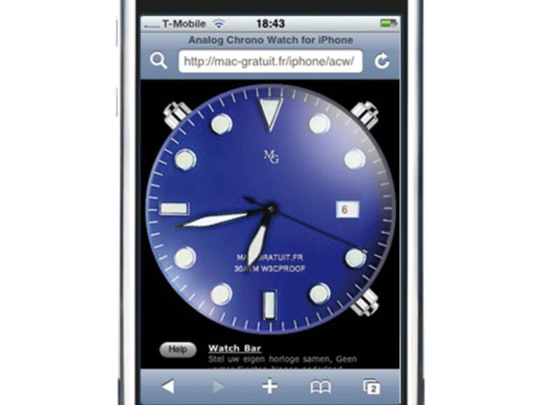 Hier findet sich das althergebrachte Ziffernblatt mit Zeigern nebst einer Datumsanzeige. A Chrono Watch lässt sich in eine Stoppuhr verwandeln, mit der sich auch Zwischenzeiten nehmen lassen. Allerdings arbeitet sie ein bisschen ungenau, die kleinste Zeiteinheit sind Sekunden. Zeitnehmer bei Olympia 2008 sollten sich also eher eine Alternative suchen. Das Erscheinungsbild lässt sich ändern, es stehen verschiedene Farben zur Auswahl. Fazit: Ganz witzig, wenn auch die Alltagstauglichkeit in Frage gestellt werden darf.