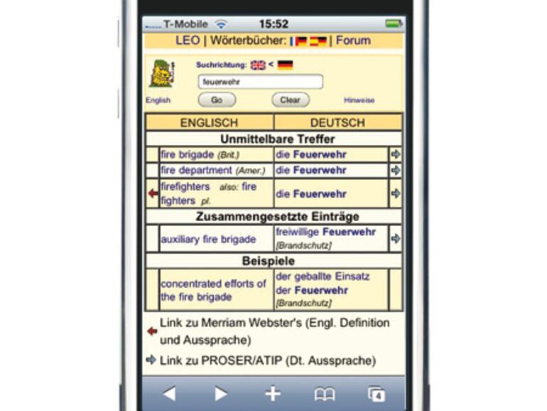 LEO zeigt nach Eingabe eines Wortes sofort eine Übersetzung und auch Alternativen an. Ergänzt wird die Liste durch zusammengesetzte Einträge und Beispiele. Vorbildlich sind die weiterführenden Links, so kann die Aussprache und die Definition des Wortes nachgeschlagen werden. Weiterhin sind Verknüpfungen zu relevanten Forenbeiträgen. Leider werden auch nicht mehr existente Verknüpfungen angezeigt. Das und das etwas veraltete Design sind aber die einzigen Kritikpunkte an einem sehr gut für das iPhone angepasste Wörterbuch.