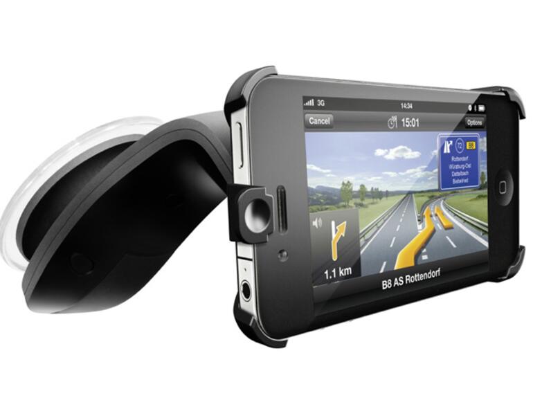 In der Halterung steckend, liegen beim Phone alle Bedienelemente sowie die Kamera frei. Man könnte während der Fahrt sogar Videos aufnehmen. Dank des schwenkbaren Gelenkkopfes kann das iPhone ergonomisch zum Fahrer und Beifahrer ausgerichtet werden. Zum Lieferumfang gehören ein Docking-Kabel und ein Zigarettenanzünder-Adapter.