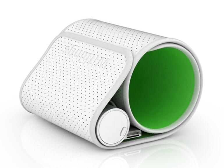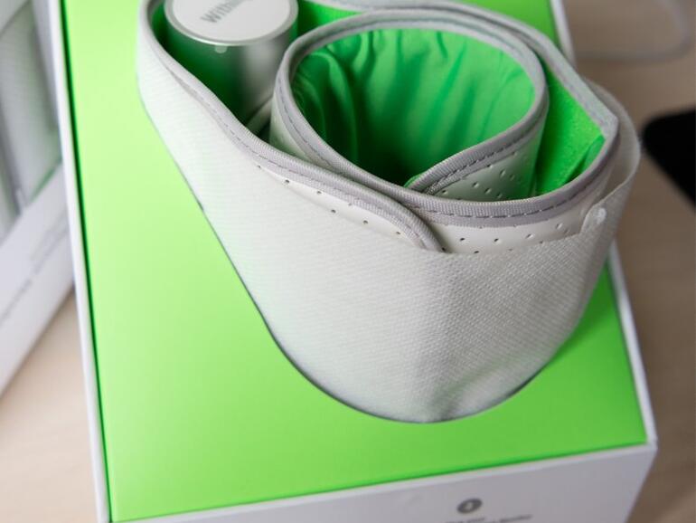 Die Hardware macht optisch einiges her und ist sauber und solide verarbeitet: Die Außenseite der Manschette besteht aus mit kleinen Löchern versehenem weißem Kunstleder, die Innenseite ist mit weichem Stretchstoff quietsch-grüner Farbe bezogen. Liebe zum Detail: Dank kleiner Magnete lässt sich Manschette bei Nichtgebrauch immer schön sauber aufrollen.