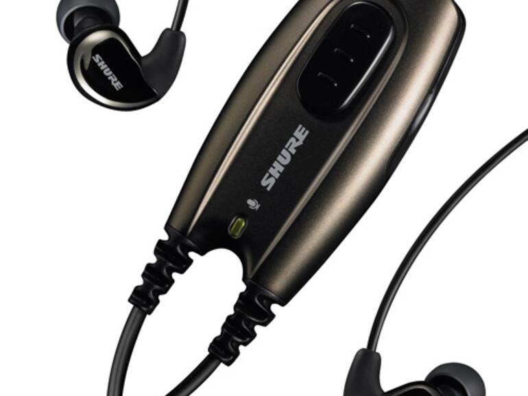 Die Dämpfung von Außengeräuschen ist derart gut, dass Shure eine Art verkabelte Fernbedienung mit eingebautem Mikrofon und der sogenannten „Push-To-Hear-Funktion“ (PTH) mitliefert. Die Musik kann hierüber auf Stumm geschaltet werden, über das Mikrofon ist man in der Lage mit der Außenwelt zu kommunizieren, ohne die Hörer abzusetzen. Klingt ein wenig futuristisch, und so fühlt es sich auch an.