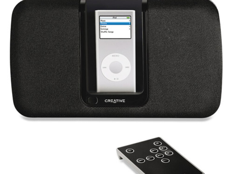 Die neue „Zusammenarbeit“ ist das Ergebnis eines Patentstreits zwischen Apple und Creative, den beide Parteien gütlich beilegen konnten. Brandneu im Creative-Portfolio ist das Modell Travelsound i, das sich für alle iPods mit Dockanschluss eignet. Über einen Line-In-Eingang auf der Rückseite lassen sich allerdings auch andere Audioquellen verbinden. Großes Lob muss man Creative zunächst bezüglich der Haptik des Gerätes aussprechen. Hier ist alles eine Spur edler, komfortabler und ansehnlicher als bei zahlreichen Mitbewerbern. Eine Ausnahme des gelungenen Designs bildet die klobige Fernbedienung, welche dafür umso besser in der Hand liegt.