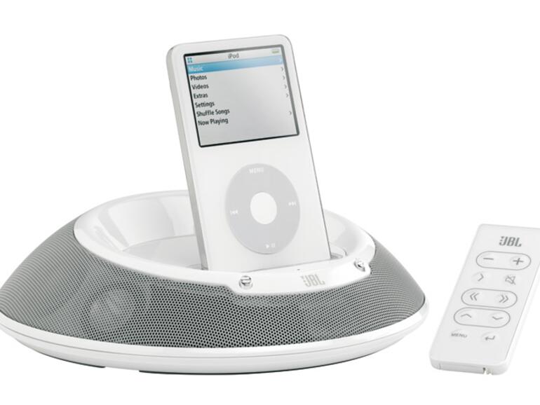 Eine Fernbedienung gewährt Zugriff auf sämtliche iPod-Funktionen, am Gerät selbst kann alternativ nur die Lautstärke geregelt werden. Das schwarze Netzteil zum weißen Gerät stört etwas den optischen Gesamteindruck, das On Stage III selbst ist jedoch auch in Schwarz erhältlich. JBL legt zahlreiche transparente Dock-Adapter bei, allerdings noch nicht für die aktuellen Modelle iPod classic und die dritte Generation des iPod nano, da diese erst später auf den Markt kamen. Nichtsdestotrotz finden auch diese Geräte im Dock des On Stage III Platz. Auf der Rückseite des Lautsprechers sind jeweils ein Audioeingang und ein Audioausgang sowie ein Mini-USB-Anschluss befindlich.