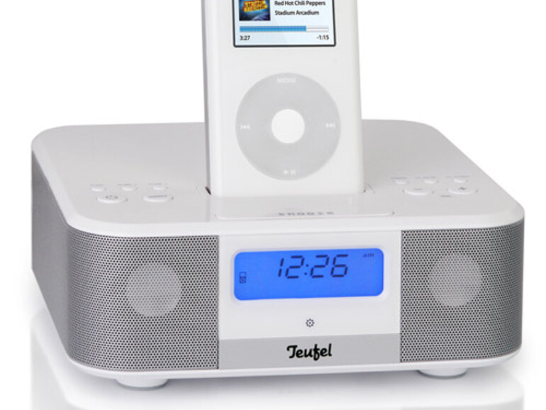Soll heißen, dem angenehmen, erstaunlich voluminösen Klang lauscht man gern, ohne entnervt nach der Fernbedienung zu suchen oder dem Ausschalt-Kopf zu hangeln. Hier scheppert nichts, hier verzerrt nichts, und Musik klingt nicht, wie durch einen Telefonhörer gespielt. Darüber hinaus verfügt iTeufel Clock auch über alle weiteren Eigenschaften, die man von einem Radiowecker mit iPod-Funktion erwartet. Sleeper-Timer-Funktion ist genauso vorhanden wie ein iPod/Radio/Signalton-Weckmodus. iTeufel Clock wird mit Fernbedienung, Universal-Adapter, USB-Kabel zum Anschluss an den Computer und Line-In-Kabel ausgeliefert.