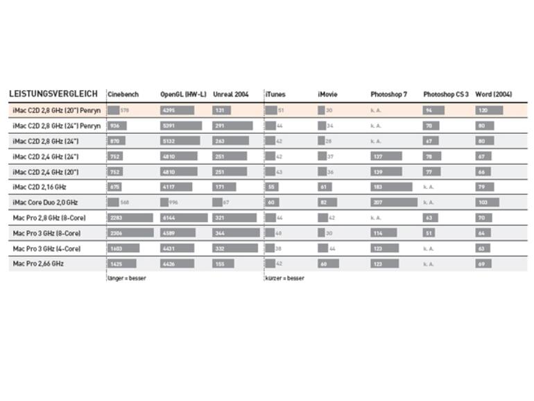 Im Test zeigte der iMac einen deutlichen Leistungsabfall im Vergleich zum in Ausgabe 07.2008 getesteten iMac 24" 2,8 GHz, im negativen Sinne ist auch der Leistungsunterschied zum 24-Zoll-iMac 2,4 GHz der Vorgängerserie auffallend. Hierbei muss allerdings erwähnt werden, dass wir damit das Einsteigermodell der aktuellen Serie mit dem leistungsfähigeren der beiden 20-Zoll-Modelle der Vorgängerreihe vergleichen. Für das Einsteigermodell der letzten Serie von Aluminium-iMacs, dem iMac 20" 2,0 GHz liegen uns leider keine Werte vor.