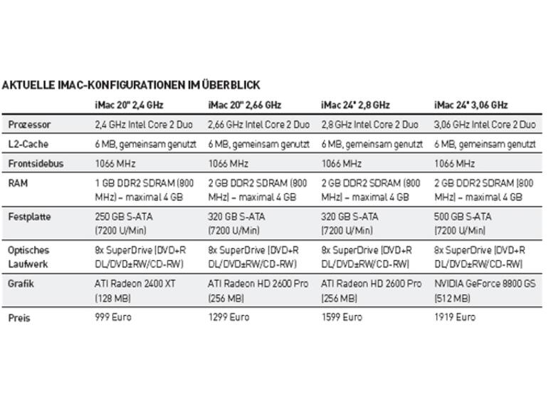 Unser Test des iMac 20" 2,4 GHz hat einen deutlichen Leistungsunterschied zwischen diesem Modell und dem in der letzten Ausgabe getesteten iMac 24" 2,8 GHz zu Tage gefördert. Insofern raten wir auch unabhängig vom größeren Display zum 24"-Modell, wenn Leistung gefragt ist. Da der iMac 24" 2,8 GHz abgesehen vom Prozessor über eine identische Ausstattung – ATI Radeon HD 2600 Pro, 2 GB RAM, 320 GB Festplatte – wie der iMac 20" 2,66 GHz verfügt, dürfte auch der 2,66-GHziMac der Einsteigervariante deutlich überlegen sein. Der schnellere 20-Zöller ist bereits für rund 300 Euro mehr zu haben. Außerdem lässt sich festhalten, dass man im Vergleich auch gern zum 20-Zoll- Modell 2,4 GHz der Vorgängerserie greifen kann, wenn dieses noch für einen günstigen Preis angeboten wird.