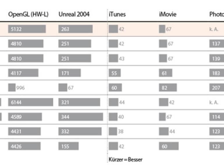 Im Vergleich zum iMac 24” 2,4 GHz weist unser Spitzenmodell eine moderate Leistungssteigerung auf. So wird unter Einsatz beider Prozessorkerne ein Bild in Cinebench 9,5 rund 14 Prozent schneller gerendert. Im Open-GL-Vergleich ist eine Steigerung von sieben Prozent auszumachen. Der Spieletest mit Unreal Tournament 2004 zeigt ebenfalls die Auswirkungen der identischen Grafikkarten. Weniger als fünf Prozent mehr Bilder pro Sekunde kann das Spitzenmodell im Vergleich zur 2,4-GHz-Version darstellen.