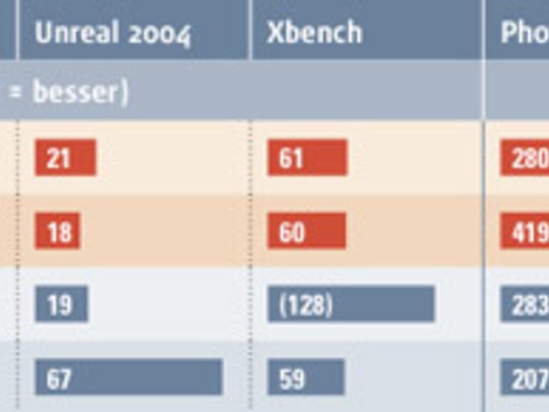 Auch im MPEG4-Export in iMovie leisten die Intel-Macs nicht das, was Steve Jobs vollmundig verspricht, denn hier übertrifft die Leistung des G4-mini die neuen Intel-Macs um das Doppelte. Da der Core-Duo-mini beim MPEG4-Export die beiden Prozessorkerne nicht optimal einsetzen kann, liegt der Leistungsgewinn im Vergleich zum Core-Solo-Modell lediglich bei etwa zehn Prozent, was in etwa dem Unterschied der Taktfrequenz der beiden Prozessoren entspricht. Auch hier muss Apple recht bald optimierte Bibliotheken für die Intel-Macs anbieten.