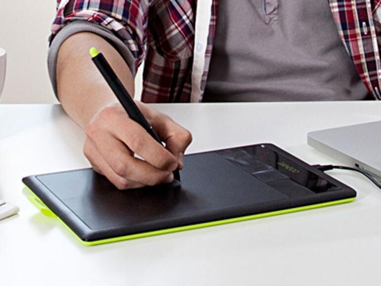 Praktisch ist, dass die Touchfähigkeit per Tastendruck abgeschaltet werden kann, so dass beim Zeichnen Fehleingaben vermieden werden. Ärgerlich ist der Umstand, dass öfter eine Berührung des Handballens als Eingabe interpretiert wird, Apples Trackpads schneiden in dieser Disziplin erheblich besser ab. Neu in dieser Bamboo-Generation ist das optional erhältliche Zusatzmodul (39,90 Euro) für die kabellose Anbindung an den Rechner. Der Empfänger ist ein kleiner USB-Stöpsel, der beim Transport im Bamboo verstaut werden kann. Ist die Akkuladung erschöpft, muss das USB-Kabel wieder angeschlossen werden. Die Eingabefläche des Bamboo entspricht etwa dem Format A6, besitzt jedoch ein Seitenverhältnis von 16:10. Der mitgelieferte Stift ist angenehm leicht, könnte aber an der Griffposition rutschfester sein.