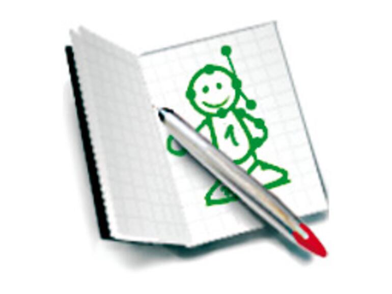 Nun kann es losgehen mit der neuen Schreib- und Zeichenfreiheit: In jedem Notizbuch befindet sich auf der ersten Seite ein Symbol „New Notebook“. Damit die Software das Notizbuch erkennt und einrichtet, muss man vor der ersten Skizze mit dem Stift darauf „klicken“. Auf der letzten Seite befindet sich das Feld zum Übertragen der Daten und zur Aktivierung des Stiftes, falls die Bluetooth-Verbindung wieder hergestellt werden muss. Außerdem lassen sich hier verschiedene Stiftfarben und Strichstärken einstellen. Physikalisch schreibt der Stift nur mit einer normalen Kugelschreibermine. Hier ist also die Vorstellungskraft gefragt, denn Farben und Strichstärken werden erst auf dem Monitor sichtbar.