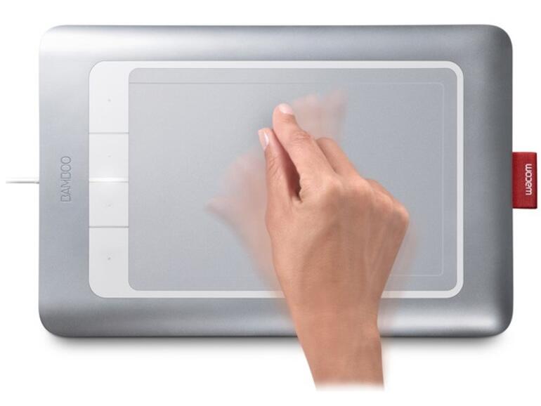 Außerdem müssen beide Finger zeitgleich auf dem Tablett positioniert werden, um die Multitouch-Erkennung zu ermöglichen. In gewohnter Wacom-Qualität funktioniert jedoch die Eingabe per Stift. Da dieser druckempfindlich ist, entfällt die sonst notwendige Einstellung des Härtegrades von Photoshop- oder Illustrator- Werkzeugen. Gleich den Vorgänger-Modellen enthält auch das neue Bamboo Fun auf der Stift-Rückseite einen Radierer. Wird das Tablett nicht benötigt, kann der Stift seitlich in eine Schlaufe gesteckt werden.