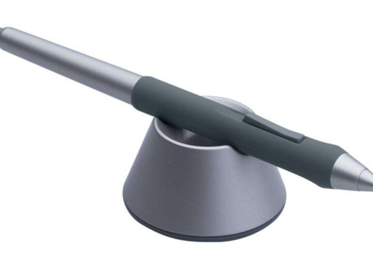 Weitere Eingabegeräte sind bei Wacom erhältlich, darunter beispielsweise ein spezieller Airbrush-Stift. Als Ablage für den mitgelieferten Grip Pen dient eine externe Stifthalterung — in manchen Situationen wäre es praktischer, den Stift direkt am Tablett befestigen zu können. Die Express-Keys, eine der Neuerungen der Intuos3-Reihe, sind auf beiden Seiten vorhanden, und somit eignet sich das Tablett für Links- und Rechtshänder. Die Belegung der insgesamt acht Tasten kann unabhängig voneinander bestimmt werden und darf sogar je nach gerade aktiver Anwendung variieren. Neben den hinzugekommenen Tasten liegt der größte Unterschied zum Intuos2 in der Auflösung des Tabletts, die von 2540lpi auf 5080lpi verdoppelt wurde.