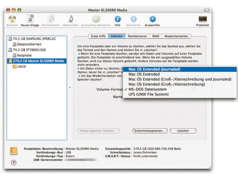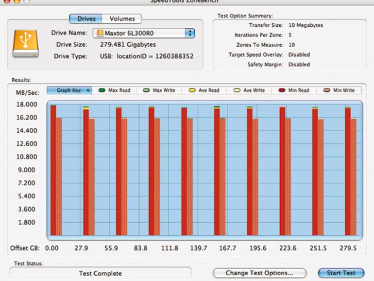 Wir testen die beiden Festplatten zunächst am Power Mac G5 und im Anschluss am Intel-iMac. Am Power Mac messen wir mit Hilfe des Programms QuickBench hinsichtlich der Leistung der 160-GB-Version bei einer Dateigröße von 64 KB eine Transferrate von knapp über zehn MB pro Sekunde (MB/s). Bei einer Dateigröße von zwei MB liegen die Übertragungsraten bei etwa 13 MB/s. Werden dagegen 20 MB große Dateien kopiert, beträgt die Lese-Rate 13,7 MB/s, die Schreib-Rate 12,5 MB/s. Die gleiche Festplatte am Intel-iMac schafft bei einer Dateigröße von 64 KB etwa 11 MB/s, bei zwei MB etwa 14 MB/s, bei 20 MB aber im Vergleich deutlich schnellere 17,4 MB/s beim Lesen und 14 MB/s beim Schreiben.