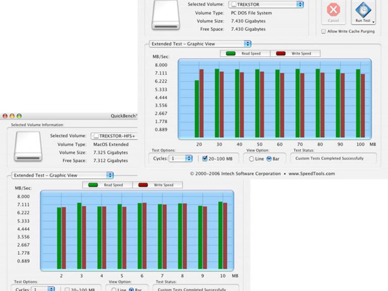 Wir testen den Stick sowohl mit einem Power Mac G5 als auch einem Intel-iMac mit dem Programm QuickBench von Intech Software. Auf dem Power Mac liest der Stick kleine Dateien von 64 KB Größe mit 4,1 MB/s und schreibt sie mit 1,3 MB/s. Dateien mittlerer Größe (sechs MB) werden mit 7,3 MB/s gelesen und geschrieben. Große Dateien (100 MB) liest der Stick mit 7,6 MB/s und schreibt sie mit 7,4 MB/s. Auf dem Intel-iMac sind die Lese- und Schreibraten nur etwas höher: So beträgt die Leserate bei 64-KB-Dateien 6,1 MB/s und die Schreibrate 1,2 MB/s. Mittelgroße Dateien (sechs MB) liest und schreibt der Stick am Intel-iMac mit 7,4 MB/s. 100-MB-Dateien werden mit mit 7,6 MB/s gelesen und geschrieben.