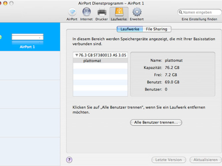 Es zeigte sich in unserem Test, dass die aktuelle AirPort-Extreme-Basisstation in einem gemischten Netzwerk mit einem des aktuellen Funkstandards mächtigen Rechner wie unserem MacBook Pro, in dem sich aber auch Rechner befinden, die mit den Standards b oder g funken, kaum einen Leistungszuwachs gegenüber dem alten Modell und einem reinen g-Netzwerk bietet. Wir verbanden unser MacBook Pro und einen nicht n-fähigen iMac Core Duo einmal über eine alte und einmal über eine neue AirPort-Extreme-Basisstation drahtlos miteinander. Die Übertragungsgeschwindigkeiten lagen mit Werten von jeweils deutlich unter 54 Mbps weit unter den Spezifikationen beider Geräte, die aktuelle AirPort-Extreme-Basisstation bot hier kaum einen Vorteil.