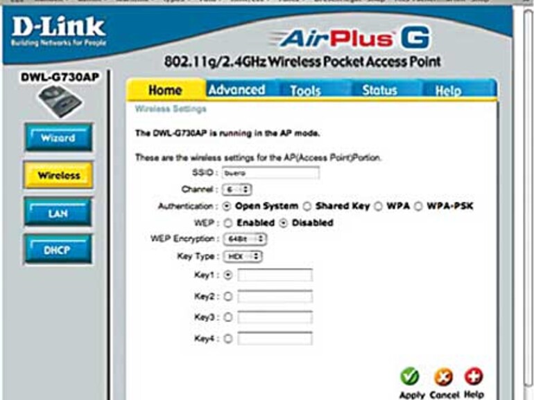 Der DWL-G730AP unterstützt WPA (Wi-Fi Protected Access), das höhere icherheit gegen Fremdzugriff als WEP bietet. Als Sicherheitsmaßnahme sollte an die werksseitigen Zugangsdaten zur Gerätekonfiguration abändern. D-Link lässt das Ändern des Default-Passworts im Setup Wizard zu. Durch den Verzicht auf eine Antenne werden WLAN-Access-Points wie der DWL-G730AP zum Handschmeichler.Leistungsfähige Router bieten deshalb mehr Reichweite und Datendurchsatz. Innerhalb von Räumen ist die Verbindung mit dem Pocket Router kein Problem, einzelne Zwischenwände und Fenster werden noch durchfunkt. Rund 2 MByte Daten werden pro Sekunde übermittelt.
