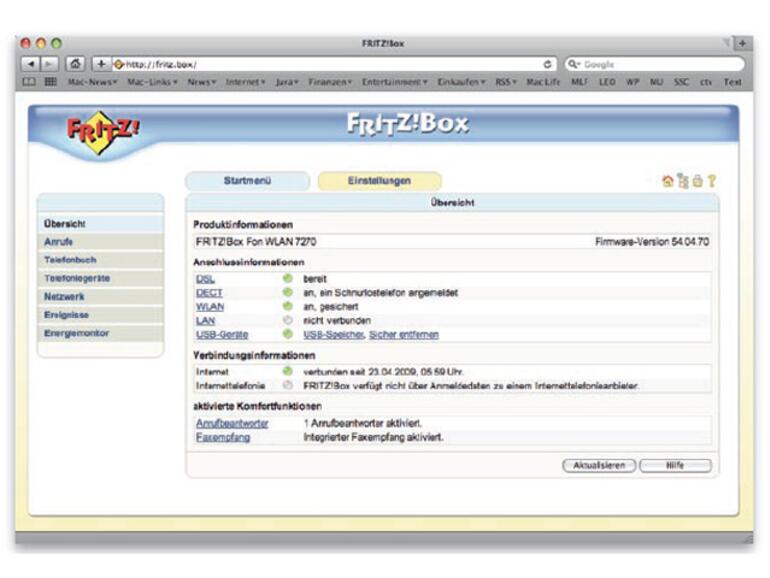 Ist erst einmal für eine Internetverbindung gesorgt, darf diese per Funk allen Rechnern im heimischen Netz zur Verfügung gestellt werden. Erstmals bietet mit der 7270 eine FRITZ!Box den aktuellen WLAN-Standard 802.11n, dessen Übertragungsleistung bei bis zu 300 MBit/s liegt. Die umgerechnet bis zu 37,5 Megabyte pro Sekunde (MB/s) lassen sich allerdings nur unter Laborbedingungen erreichen: In der Praxis ist bei sechs bis sieben MB/s Schluss; ein typischer Wert für aktuelle WLANNetzwerke. Ein Dual-WLAN-System, wie in Apples aktueller AirPort Extreme verbaut ist, bietet die Box allerdings nicht. Deswegen bremsen ältere WLAN-Geräte im Netz den schnellen 802.11n-Betrieb aus – um mit ihnen kommunizieren zu können, schaltet das gesamte Netz automatisch auf das langsamere 802.11g-Protokoll herunter. Ein Verhalten, das alle WLAN-Basisstationen an den Tag legen.