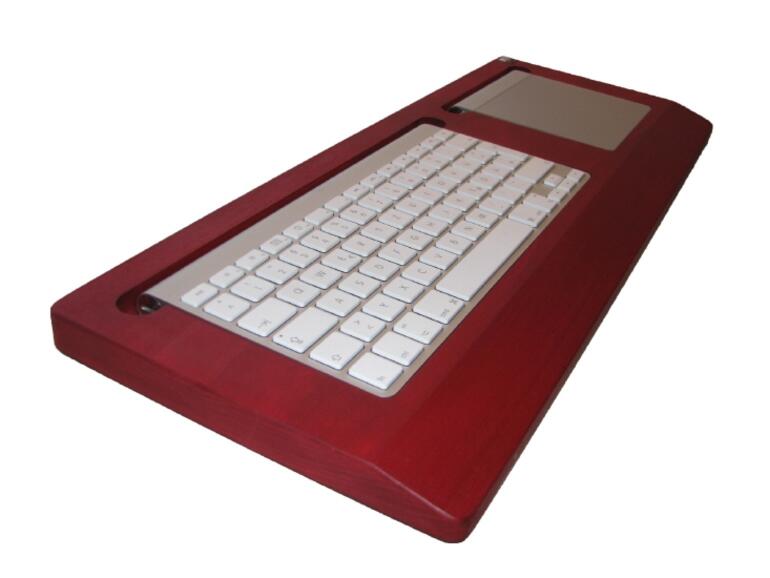 Aber auch auf dem Schreibtisch macht Woody’s Tray eine gute Figur: Trackpad und Tastatur verrutschen nicht mehr gegeneinander, da sie eine Einheit bilden. Die Ergonomie wird mit dem Tray ebenfalls befördert, da Tastatur und Trackpad eine Handballenauflage erhalten, die sich sehr angenehm anfasst. Der Hersteller fertigt die Halterung aus verschiedenen Hölzern wie Nussbaum, Kirschbaum oder Buche, gebeizte Buche oder Ahorn ist in veschiedenen Farben bestellbar. Die gefrästen Aussparungen sind nicht zu knapp dimensioniert, so dass sich eingelegte Geräte leicht wieder herausnehmen lassen, selbst ein Akkupack wie der von Mobee angebotene passt in die Mulde. Nach dem Fräsen wird das Material von Hand nachbearbeitet und umweltverträglich veredelt, was sich in der hohen Qualität der fertigen Stücke niederschlägt.