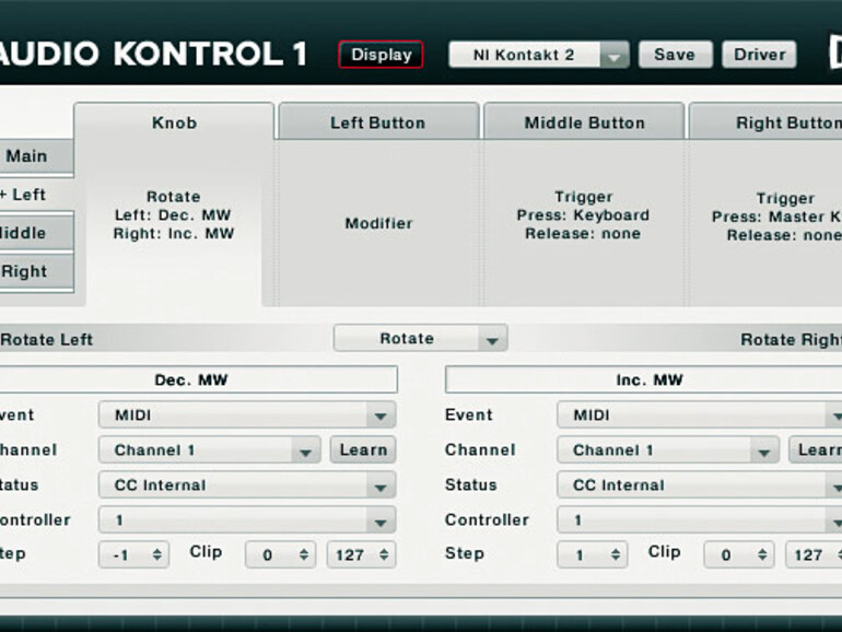 Der Clou am Kontrol 1 sind aber sicherlich seine vier eingebauten MIDI-Controller, denen sich zusätzliche Steuer-aufgaben frei zuweisen lassen. Die drei Taster können dabei entweder im Trigger- oder Toggle-Modus arbeiten, auf diese Weise also einzelne Funktionen auslösen oder auch einzelne Spuren oder Baugruppen der Klangerzeugung ein- oder ausschalten. Im Modifier-Modus dagegen wirken sie quasi als „Shift-Taste“ für den Dreh-Encoder oder die beiden anderen Taster, sodass auch diese weitere Funktionen übernehmen können. Neben MIDI-Informationen lassen sich auch Tastatur-Kommandos senden, um beispielsweise Programme wie Winamp oder iTunes fernsteuern zu können.