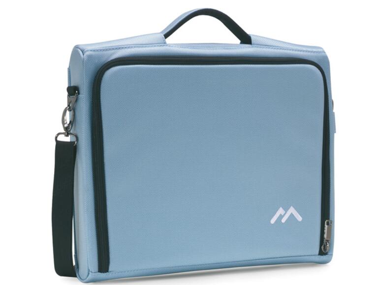 Angenehm ist die Möglichkeit, den Rechner auch innerhalb der Tasche betreiben zu können, denn die seitliche Öffnung lässt sich gut nach hinten klappen. Im Dauerbetrieb dieser Art erwärmt die fehlende Luftzirkulation aber den Mobil-Mac recht stark. Neben dem MacBook passen noch Papier und einige CDs oder DVDs in die Hülle – Platz für das Netzteil ist nicht vorhanden. Das helle Blau der Außenhaut zeigt sich schmutzanfällig, lässt sich aber einfach säubern.
