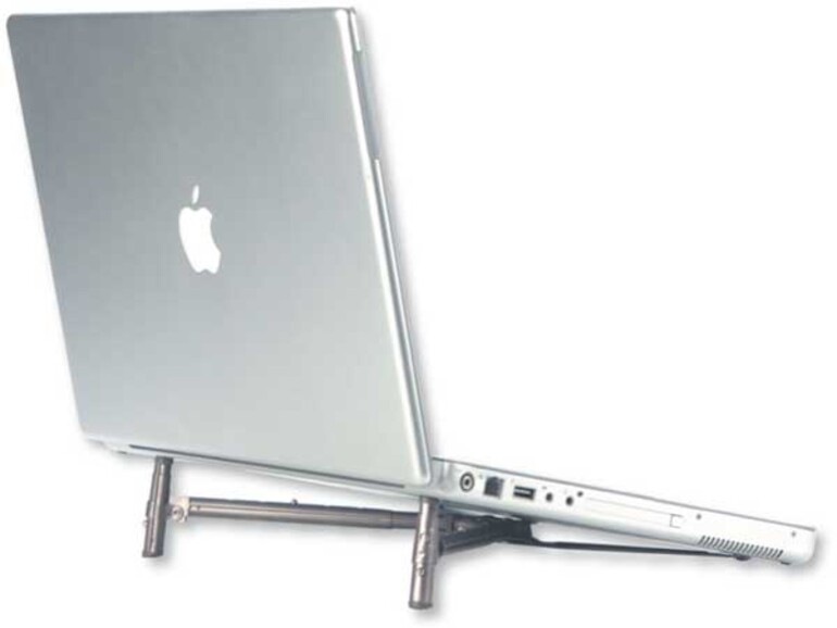 Wir probieren den XT-Stand mit einem 12-Zoll- und einem 15-Zoll- PowerBook aus. Die Länge der Standbeine lässt sich auf einfache Weise dem jeweiligen Rechner anpassen. Auch der Neigungswinkel kann auf die gleiche Weise den eigenen Wünschen angepasst werden. Um Medien beim optischen Laufwerk des 15-Zöllers nutzen zu können, wird ein Hebel umgeklappt, so dass der Weg zum Laufwerksschlitz frei ist. Gummifüsse verhindern das Rutschen des Rechners.