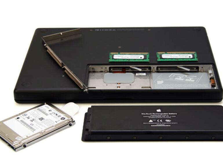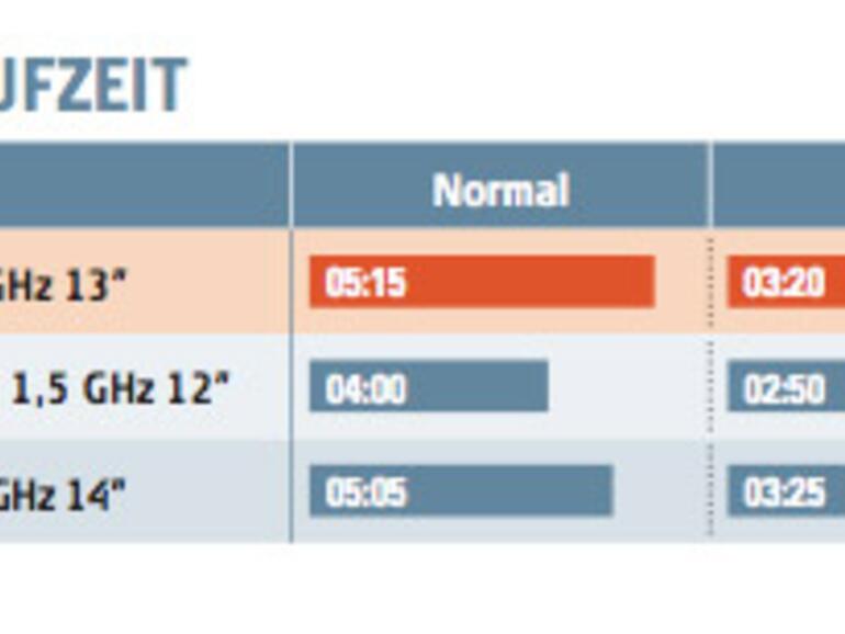 Im Hinblick auf die Akkuleistung hatte es das MacBook mit dem iBook G4 als bisher unangefochtenem König der Laufzeit zu tun. Auch wenn das iBook bei der DVD-Wiedergabe fünf Minuten länger als das MacBook durchhielt, musste es sich bei der Laufzeit beim Erledigen von Büroarbeiten um zehn Minuten geschlagen geben. Das MacBook arbeitet sehr leise, und auch unter Volllast konnten wir die Lüfter nicht hören. Ein Fiepen wie bei manchen Modellen des ersten MacBook Pro war ebenfalls nicht zu hören. An der Unterseite wird das Gerät sehr warm, so dass es nicht möglich ist, längere Zeit rechenintensive Aufgaben erledigen zu lassen und dabei das MacBook auf den Beinen zu halten.
