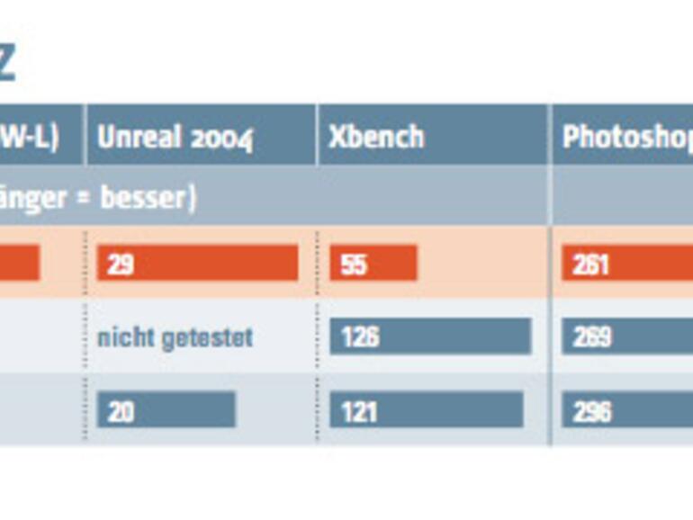 Auch hinsichtlich der Grafikleistung beim OpenGL-Test sichert sich das MacBook souverän den ersten Platz, wobei auch hier die gleichen Bedenken wie beim ersten Test gelten. Beim Spieletest in Unreal Tournament 2004 verbucht das MacBook eine deutlich bessere Leistung als das iBook G4, denn es kann den allgemeinen Erwartungen zum Trotz eine um 45 Prozent höhere Bildwiederholrate erzielen. Die Werte im Testprogramm Xbench drucken wir nur der Vollständigkeit halber ab, da sich seit der Version 1.2 der Maßstab geändert hat und daher ein Vergleich unmöglich ist.