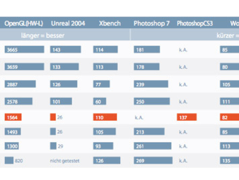 Der gute Wert des MacBook in Photoshop ergibt sich aus der Tatsache, dass wir dieses Modell mit der für Intel-Macs optimierten Beta-Version von Photoshop CS3 messen. Um ein Verhältnis herzustellen: Der Mac Pro 3,0 GHz (8-Core), den wir ebenfalls mit der aktuellen Universal-Binary-Version des Adobe-Standards getestet haben, erledigt unsere Photoshop-Aufgaben mehr als doppelt so schnell wie das aktuelle MacBook.