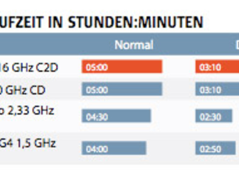 Zur Akkulaufzeit kann zunächst gesagt werden, das die aktuelle MacBook-Variante mit 2,16 GHz-Taktung der Vorgängervariante respektive dem Einstiegsmodell mit 2,0 GHz C2D-Prozessor in nichts nachsteht. Bei reiner DVD-Wiedergabe hält das MacBook rund drei Stunden und zehn Minuten durch, im Normalbetrieb bis zu fünf Stunden. Im Vergleich zum 2,0-GHz-MacBook mit C2D-Prozessor zeigen sich in der Leistung größtenteils nur geringfügige Unterschiede: iTunes leistet beim Importieren vom AIFF- ins MP3-Format seine Arbeit zwei Sekunden schneller, ein zu vernachlässigender Wert also. Die Verarbeitung eines 1027 Seiten langen Word-Dokuments erfolgt ebenfalls rund zwei bis drei Sekunden schneller. Wirft man einen Blick zurück auf das ehemalige High-End-Modell der MacBooks, die 2,0 GHz-Variante mit Core-Duo-Prozessor, so wird allerdings offenbar, dass Apple hier bereits Einiges an Leistung in den letzten Monaten nachgelegt hat. Das MacBook 2,0 GHz mit Core-Duo-Prozessor erledigte unsere iTunes- und Word-Arbeitsaufträge noch rund 19, respektive 28 Prozent langsamer.