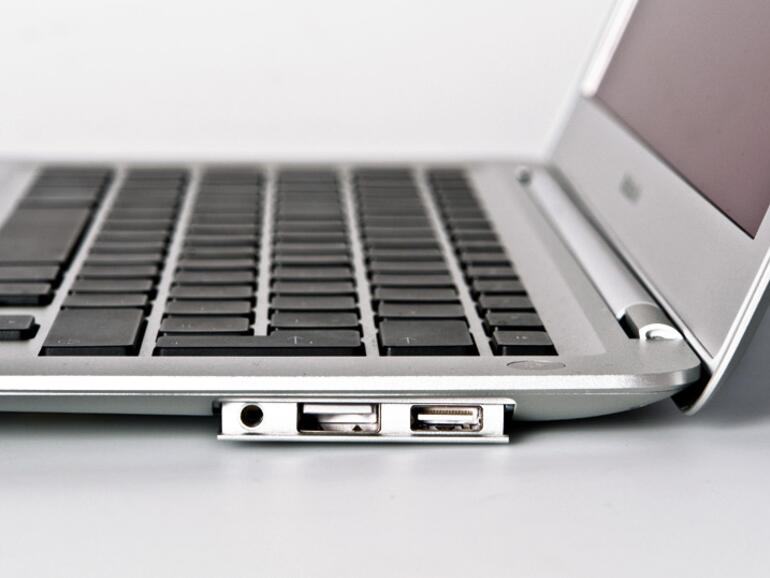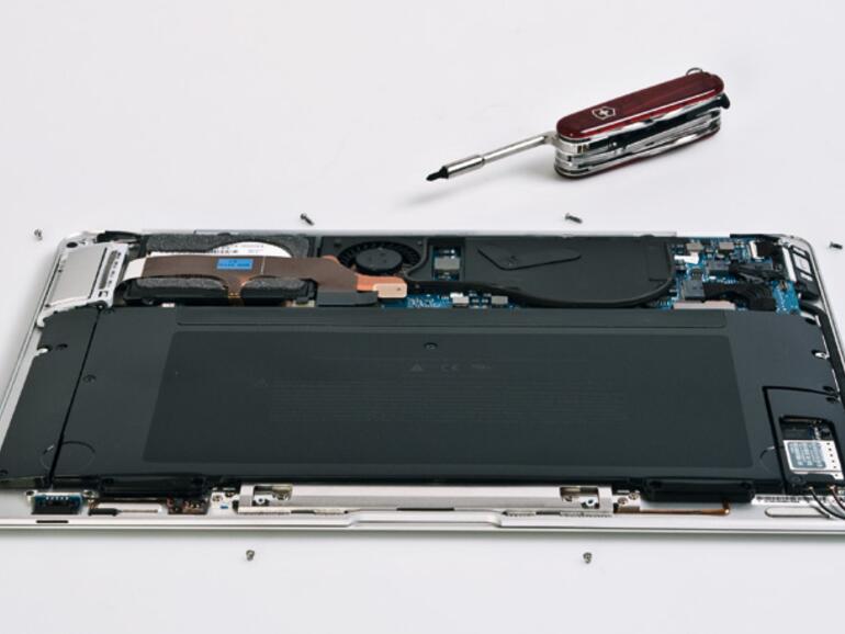 Der MagSafe-Stromanschluss links und die drei Anschlüsse rechts sind beim Blick auf den Bildschirm des Air nicht zu sehen. Daher muss der Anwender immer die entsprechende Seite heben oder sich dorthin beugen. Auch das Einstöpseln des jeweiligen Steckers in einen Anschluss erweist sich als umständlich – hier herrscht Optimierungsbedarf. Ein weiterer Minuspunkt ist der fest eingebaute Akku, denn er kann nicht vom Anwender getauscht werden. Somit lässt sich weder ein zweiter Akku für verlängerten Batteriebetrieb einsetzen, noch der Akku wechseln, wenn er irgendwann den Geist aufgibt. Für den Akkutausch verlangt Apple zurzeit 139 Euro.