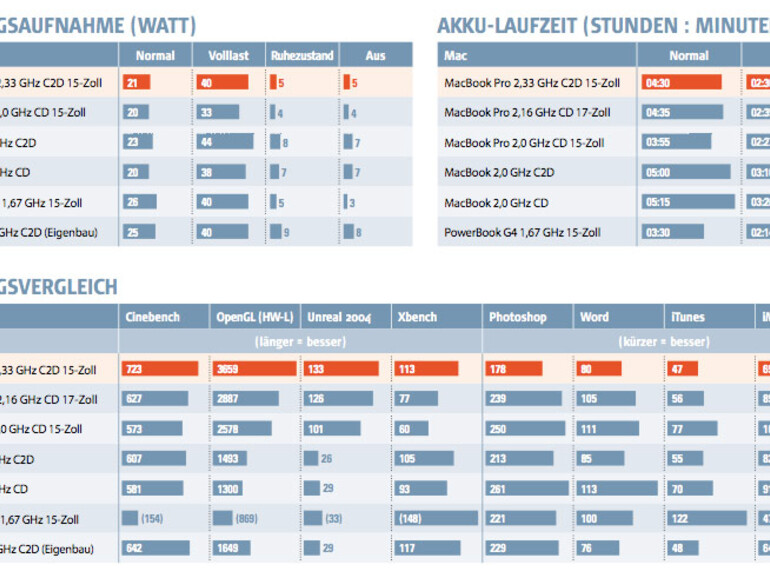 In Photoshop liegt das aktuelle Modell mit einem Zeitgewinn von 29 Prozent abermals vorn. Interessant ist hier ein Blick auf den Wert des PowerPC-basierten PowerBook G4 1,67 GHz, da Photoshop nativ auf der Plattform läuft. Hier liegt das MacBook Pro im Vergleich um 19 Prozent vorn. Apple hat offensichtlich stark an Rosetta gearbeitet. Auch in der zweiten, nicht-nativen Software ist der neue Portable schneller als sein Vorgänger und auch das PowerBook G4: Um deutliche 28 Prozent ist unsere in Microsoft Word gestellte Aufgabe schneller fertig als auf dem Vormodell. Zwischen PowerBook und MacBook Pro C2D sind es immer noch stattliche 20 Prozent.