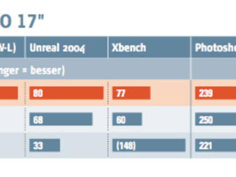 Beim Photoshop-Test kommt zum ersten Mal Rosetta zum Einsatz. Hier liegt das PowerBook G4 1,67 GHz um etwa acht Prozent vor Apples neuem Flaggschiff. Auch in Microsoft Word, das ebenfalls noch nicht nativ vorliegt, geht das PowerBook knapp zuerst durch das Ziel. Anders sieht es wiederum in iTunes aus: Beim Kodieren unserer Test-CD von der Festplatte ist der 17-Zöller um etwa 88 Prozent schneller als das PowerBook G4 und ungefähr 18 Prozent schneller als das 15-Zoll-Modell. In iMovie allerdings, wo wir einen Film ins MPEG4-Format exportieren lassen, ist das neue Topmodell in 89 Sekunden fertig; sein Vorgänger schaffte die gleiche Aufgabe innerhalb 47 Sekunden, was einen Vorteil von etwa 90 Prozent zugunsten des Vorgänger bedeutet. Hier ist noch Optimierungsarbeit von Apple gefordert.