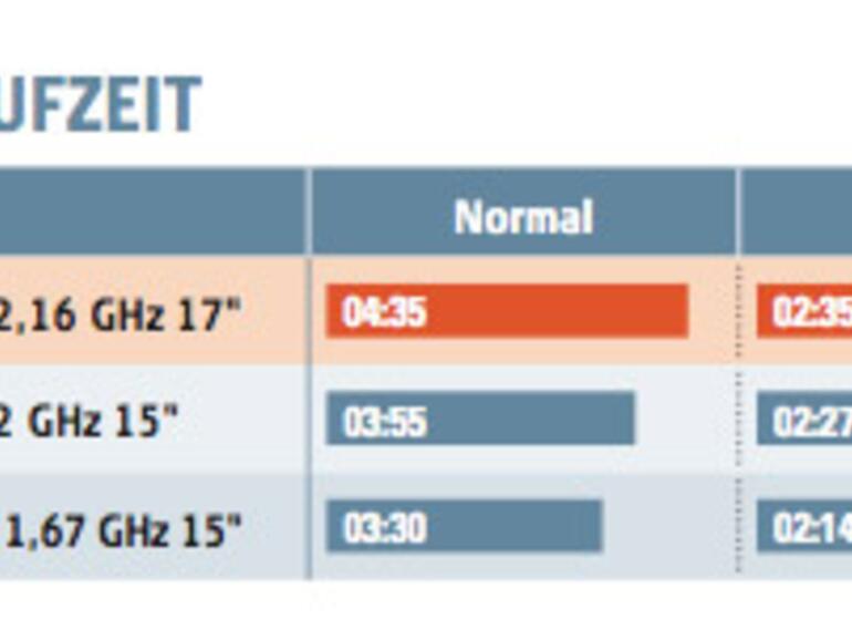 Das neue Topmodell unter den Apple-Portablen weiß, sich in Szene zu setzen: nicht nur durch die sehr gute Leistung in unseren Tests, sondern auch durch leises Arbeiten und einen guten Bildschirm. Lediglich beim Einsatz von nicht nativer Software werden Umsteiger vom PowerBook G4 keinen Leistungsgewinn verspüren, können aber mit fast der gleichen Produktivität weiterarbeiten und von den vielen Verbesserungen des MacBook Pro 17” profitieren. Die Akkuleistung geht mit etwa 2,5 Stunden beim Betrachten von DVDs und ungefähr 4,5 Stunden bei Büroarbeiten in Ordnung.
