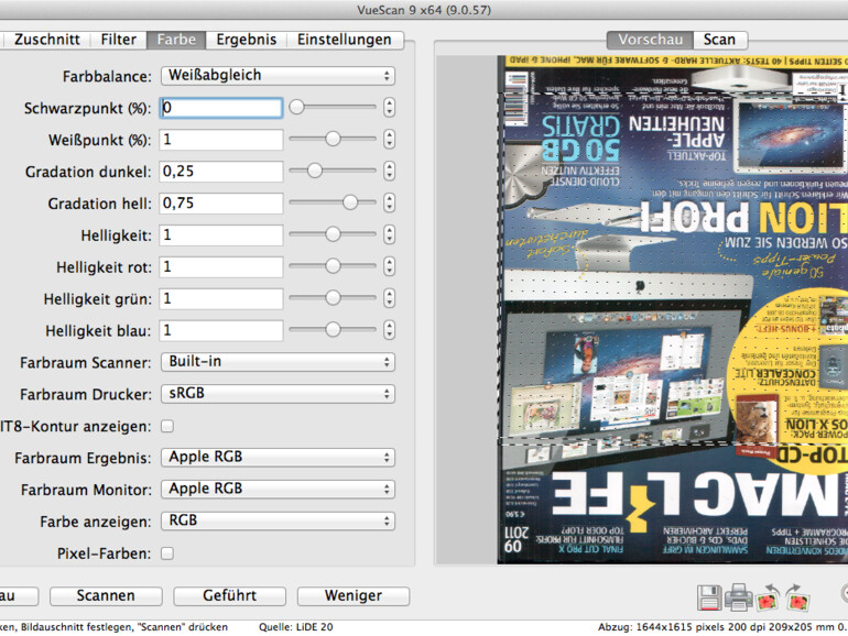 Auf den ersten Blick mutet die Forderung von rund 30 Euro für einen universellen Scanner-Treiber unangemessen an. Doch die von Ed Hamrick mehr als zehn Jahre stetig weiterentwickelte Software ist mehr und jeden Cent wert, auch wenn die Oberfläche unter Lion etwas altbacken daher kommt. Vorbildlich hingegen die deutsche Lokalisierung in Bildschirmtexten und Menüs. Im Test mit einem Canon N670U, für den der Hersteller keine geeigneten Treiber anbietet, entfiel gar die Konfiguration. Die Software war sofort einsatzfähig. Vor dem Einlesen können unter anderem Art der Vorlage (Foto, Text, Zeichnung, …), Qualität und Auflösung eingestellt werden. Die erweiterten Optionen sind für Einsteiger erschlagend, diese reichen von der automatischen Weitergabe an den Drucker über automatische Wiederholungen bis hin zu Korrekturen in der Rotation. Diese Vielfalt in den Einstellungen setzt sich in weiteren Untermenüs fort. Farbkorrekturen, -Restauration und die automatisierte personalisierte Erfassung von Metadaten gehören zu den alltäglich nutzbaren Funktionen, weitere richten sich an deutlich fortgeschrittene Anwender. Alle Funktionen können mit einer Testversion erprobt werden. Allerdings wird hier ein digitales Wasserzeichen in die Abbilder gestempelt.