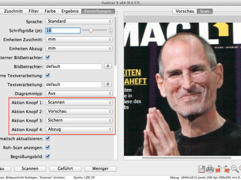 Mehr Mark, mehr Fleisch. Für 60 Euro wird die Professional-Version angeboten. In der Erweiterung zur Standard-Version erlaubt diese das Erstellen Raw-Scan-Dateien, eine IT8-Farbkalibrierung und unterstützt ICC-Profile und Farbräume. Wem diese Begriffe nichts sagen, der ist mit der Standard-Version umfänglich bedient. Einziger Wermutstropfen: Die Standard-Edition von VueScan kann lediglich für die Dauer eines Jahres kostenlos aktualisiert werden. Pro-Anwender können die Update-Funktion zeitlich unbeschränkt nutzen.