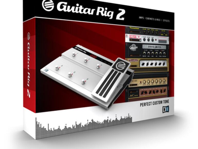 Die wohl größte Neuerung von Guitar Rig 2 ist die völlig überarbeitete Version des Rig Kontrol 2. Während es in der ersten Version “nur” ein Fußschalter war, und man noch eine zusätzliche Soundkarte brauchte, um Gitarre oder Bass im Computer aufzunehmen, spendiert uns Native Instruments mit dem Rig Kontrol 2 eine Komplettlösung, die es in sich hat. In dem äußerst solide verarbeiteten Tretschalter aus Metall, der auch ohne Probleme mal ein wüstes Konzert übersteht, verbirgt sich jetzt auch eine USB-2-Soundkarte mit zwei Monokanälen inklusive separatem Gainregler, einem Gitarrenvorverstärker und einer DI-Box – ein immenser Vorteil, denn mit dieser Out-of-the-Box Lösung braucht es nichts anderes mehr, um direkt loslegen zu können.