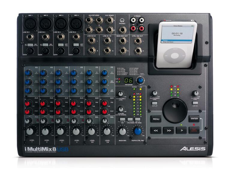 Dank des iMultiMix8USB von Alesis hält Apples allgegenwärtiger iPod nun sogar Einzug in das Recording-Studio, denn der kompakte Tabletop-Mixer vereint acht vollständige analoge Kanalzüge mit Send- und Return-Wegen, einen hochwertigen digitalen Effektprozessor und eine iPod-Steuerzentrale zu einer optimalen All-In-One-Recording-Lösung für nahezu jede Aufnahmesituation.