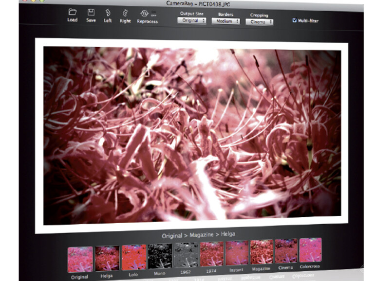 Normalerweise bringt jeder Filter seine eigenen Einstellungen zum Bildformat (quadratisch, 6 × 4, 4 × 3, 7 × 6 und Breitbild) und Rahmen mit. Dies kann in CameraBag Desktop aufgehoben werden. Der Cinema-Filter hat dann nicht mehr zwangsweise schwarze Balken oben und unten, Helga bekommt den Rahmen des Instant-Camera-Filters, und Magazine gibt es dann auch quadratisch.