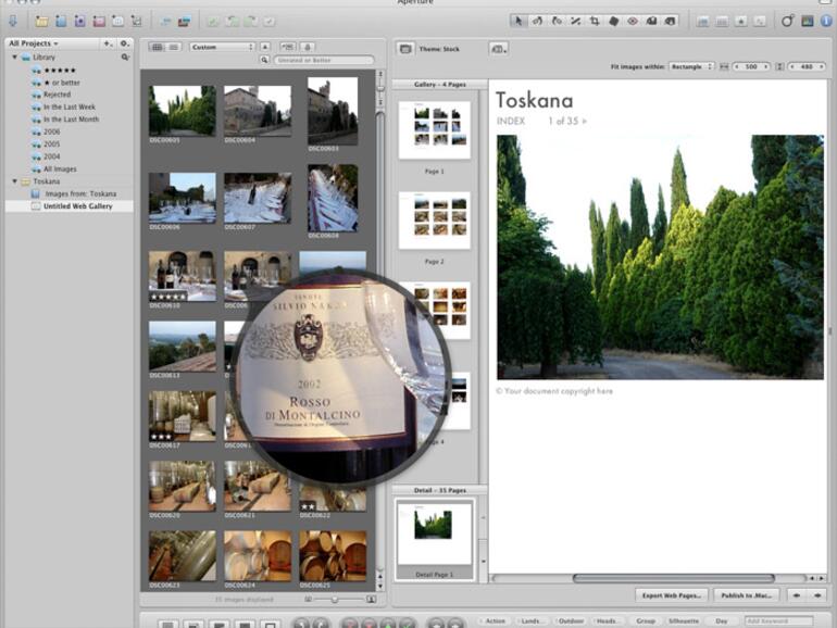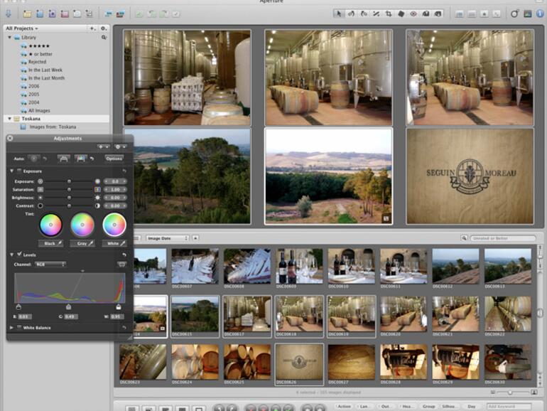Aperture nutzt nicht nur die Core-Image-Technologie, sondern auch weitere Bestandteile des Betriebssystems: etwa den Tiger-Automator für die Stapelverarbeitung von Prozessen, die auf alle Bilder einer Produktion angewendet werden müssen. Das kann beispielsweise der Weißabgleich sein, wenn bei einer Veranstaltung unter Mischlichtverhältnissen fotografiert wurde, oder auch das Entflecken von Bildserien, bei denen etwa Staub auf dem Sensor die Bildqualität beeinträchtigt. Für umfangreichere Prozess-Automatisierungen kann AppleScript genutzt werden. Nach der Aufbereitung der Bilder unterstützt Aperture den Fotografen noch bei der Präsentation der Ergebnisse für Kunden auf einem virtuellen Leuchttisch, in Stapeln, per Index-Print, Fotobuch oder Webseite. Die Bedienung ist denkbar einfach und intuitiv, woran die angenehm nüchterne Oberfläche einen erheblichen Anteil hat.