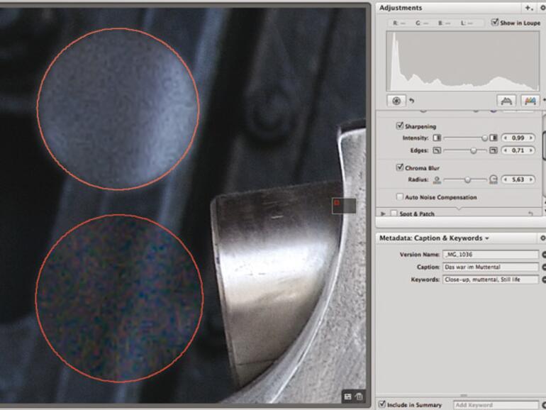 Mit der neuen Version 1.1 hat Apple gezeigt, dass der Hersteller seine Kunden und ihre Kaufkraft ernst nimmt. Der bewährte Workflow ist unverändert, der RAW-Konverter wurde dagegen neu geschaffen – und der Preis erfreulicherweise reduziert. Und tatsächlich: Das Ergebnis lässt sich sehen. Während unter Aperture 1.0 einfarbige Flächen und dunkle Bildpartien hässliche Artefakte aufwiesen, harte Kanten unsauber und gezackt erschienen, sind die Zeiten der Klötzchenbildung unter 1.1 offenbar vorbei. Die Testbilder verschiedener Kameratypen zeigen deutliche Verbesserungen – wesentliche Farbverschiebungen kommen nicht mehr vor. Auch das „weiße Rauschen“ in Schatten ist verschwunden, das Entrauschen wird verbessert durch die „Auto Noise Reduction“, Farbrauschen lässt sich über einen Regler fein dosiert unterdrücken („Chroma Blur“). Ausgefressene Lichter gehören der Vergangenheit an, der neue „Boost“-Regler zur Einstellung des Bildkontrasts macht es möglich.