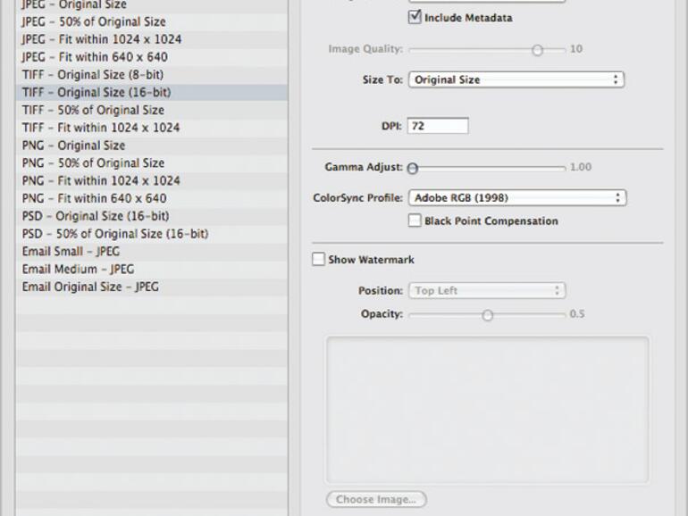 Verbessert wurde auch der Schärfungsgenerator, dessen frühere Wirkung in den Anwenderforen verhöhnt wurde. Hier lässt sich neben dem Radius nun auch die Kantenschärfe regeln. Immer noch kann Aperture hier Boliden wie Capture One nicht das Wasser reichen, wer höchste Qualität will, muss mit Noise Ninja nachschärfen. Das neue Colorimeter zeigt die RGB-Werte im Einstellungsfenster und auf Wunsch auch in der Lupe. Mit „Color Monochrome“ lassen sich Bilder nun auch in anderen Farbtönen als Sepia einfärben. Weitere Änderungen hat Apple beim Dateiimport zugelassen: Auch Photoshop-Dateien mit Ebenen werden nun akzeptiert, und IPTC- und EXIF-Daten lassen sich erhalten, im Master jedoch nicht verändern. Erstmals lassen sich auch die RAW-Finetuning-Einstellungen als Kamera-Setting speichern und laden. Gestapelte Bildhaufen muss man nicht mehr auflösen, um ihren Inhalt in Publishing-Projekten zu verwenden. Der Bildexport wird nun beschleunigt durch die Möglichkeit, dateiformatabhängige Vorgaben für Bildgröße, Qualität und RGB-Farbprofile anzulegen.