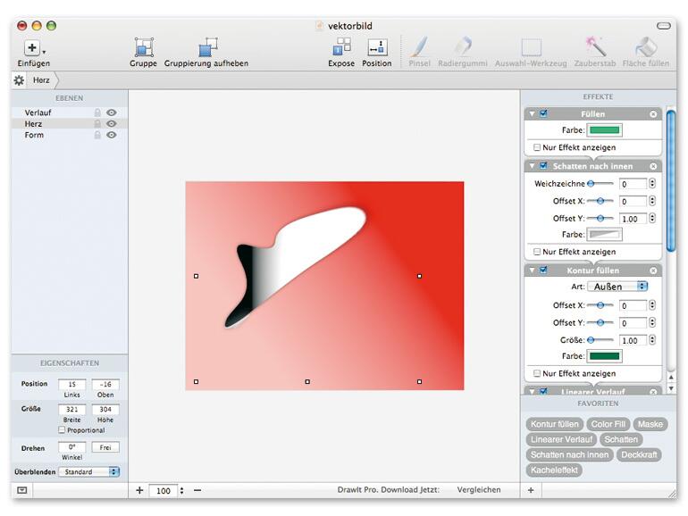 Ganz verschließt sich DrawIt Lite der Rastergrafik nicht: Bitmap-Bilder können importiert werden und auf neu angelegten Ebenen ist es möglich, mit Pinsel und Farbeimer zu arbeiten. An vordefinierten Vektorformen sind Kreis, Rechteck, Stern, Pfeile und Dreieck vorhanden, die Mithilfe ihrer Ankerpunkte anschließend in die gewünschte Form gezogen werden. Im Effekte-Bereich erfolgt dann die Füllung, Veränderung der Kontur, Schattenwurf und Verlauf. Häufig benutzte Effekte finden in den Favoriten Platz, es steht aber die gesamte Palette an Core-Image-Filtern zur Verfügung.