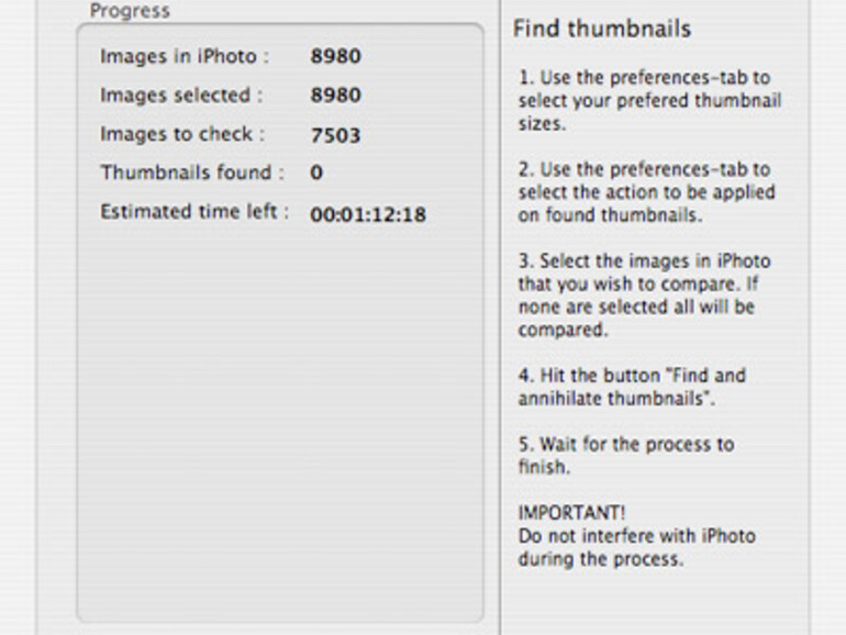 Dagegen hilft das Duo Duplicate und Thumbnail Annihilator. Letzteres ist ein separates Programm und durchforstet die iPhoto-Bibliothek nach unerwünschten Mini-Bildern. Das können beispielsweise Überbleibsel von iPod-„Widgets“ sein. Da iPhoto keine intelligenten Alben mit der Bildgröße als Kriterium erlaubt, können diese Grafiken nicht so einfach gefunden werden. In den Einstellungen wird die Maximalgröße der Bilder angegeben, alles was kleiner ist, wird im Kommentarfeld mit einem wählbaren Wort markiert oder in den Papierkorb befördert. Wenn Thumbnail Annihilator die ganze Bildersammlung durchpflügt, kann es etwas dauern – bei der knapp 9000 Fotos umfassenden Sammlung waren es etwa 90 Minuten.