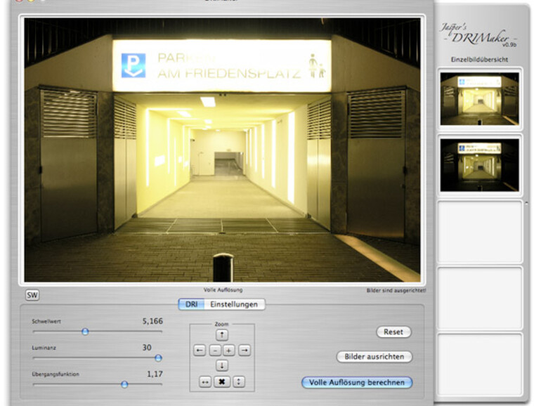 Jasper's DRIMaker erzeugt DRI-Bilder aus bereits vorhandenen JPEG- und TIFF-Dateien. Viel muss dazu nicht getan werden: Einfach die Bilder im Programm öffnen, ausrichten und dann berechnen lassen. Natürlich bleibt aber noch Platz für etwas künstlerische Freiheit: Wie gut beispielsweise der Schriftzug im Beispielbild zu lesen sein soll, kann das Programm schlecht für den Benutzer entscheiden. Mit den Reglern Luminanz, Schwellwert und Übergangsfunktion kann eine manuelle Anpassung vorgenommen werden, deren Ergebnis nach kurzer Zeit als Vorschau erscheint. Die Berechnung der hohen Auflösung geht auf einem MacBook Pro sehr flott. Das fertige Bild kann als JPEG, TIFF oder PNG gesichert werden, die Einstellungen dazu werden nicht in der Dateiauswahl, sondern im Hauptfenster getroffen.