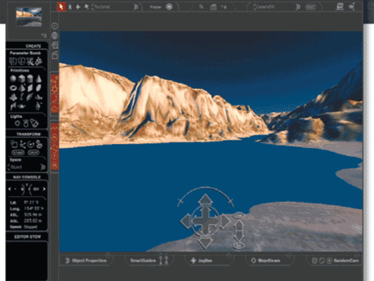 Ist die Welt erschaffen, geht es auf Entdeckungstour. Anders als in den bereits erwähnten Landschaftsgeneratoren folgen Sonne und eingefügte Trabanten festen Bahnen. Wie im richtigen Fotografenleben muss in Abhängigkeit der Sonnen- und Planetenkonstellation der geeignete Standplatz gefunden werden. Das „JogNav“ übernimmt die allgemeinen Richtungsänderungen wie Drehen, Neigen, Vorwärts und Rückwärts beim Manövrieren in der Landschaft. Die „MojoViews“ liefern Übersichtsbilder aus den drei Hauptachsen. Im „Fly“ und „zero G“ Mode heben Sie ab und bewegen sich fortan als Pilot oder Astronaut. Derart beflfl ügelt kann die Welt auch einfach mal auf dem Kopf stehen. Hingegen macht die „Random- Cam“ die Entdeckungsreise auf Ihrem Planeten zum Glücksspiel.