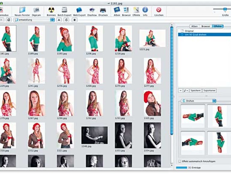 Browser durch Ordner manövrieren, mit gehaltener Apfel-Taste mehrere Bilder selektieren und die Auswahl in Alben ablegen. Haben Sie bisher mit iPhoto gearbeitet, importiert Picture Arena nach dem ersten Programmstart Ihre Alben.