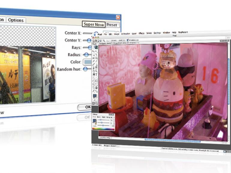 Ohne Probleme arbeiten hingegen die Filter. Da Pixel plattformunabhängig entworfen wurde, ist es nicht verwunderlich, dass die CoreImage-Filter fehlen. Dennoch ist einiges vorhanden, von verschiedenen Weichzeichnern bis zum Lens Flare. Jeder Filter bietet einen eigenen Dialog mit Vorschau und Parametern, wobei Erstere nicht immer das widerspiegelt, was am Ende auch herauskommt.